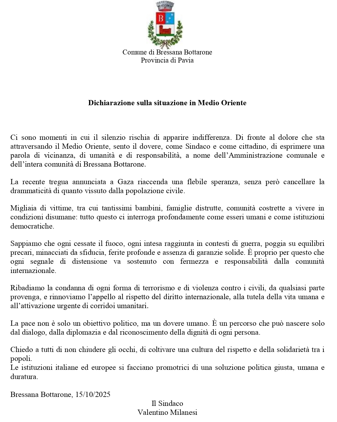 In occasione dell’annuncio di una nuova tregua a Gaza, e di fronte al perdurare di una grave crisi umanitaria che colpisce duramente le popolazioni civili, ritengo doveroso esprimere una riflessione pubblica a nome dell’Amministrazione comunale.
