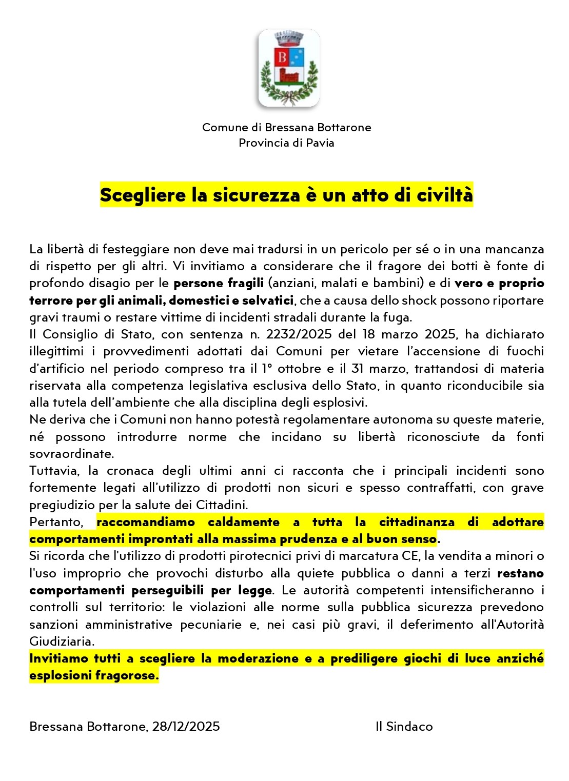 La libertà di festeggiare non deve mai tradursi in un pericolo per sé o in una mancanza di rispetto per gli altri. Vi invitiamo a considerare che il fragore dei botti è fonte di profondo disagio per le persone fragili (anziani, malati e bambini) e di vero e proprio terrore per gli animali, domestici e selvatici, che a causa dello shock possono riportare gravi traumi o restare vittime di incidenti stradali durante la fuga.