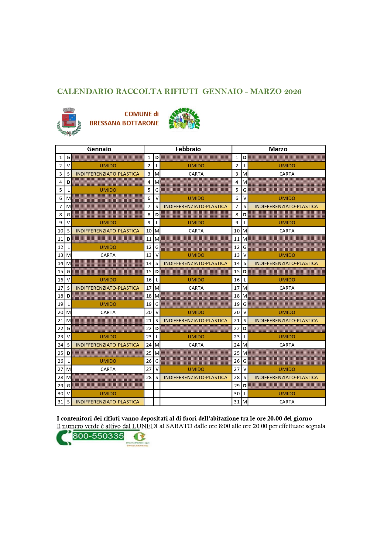 Calendario raccolta rifiuti - Gennaio-Marzo 2026