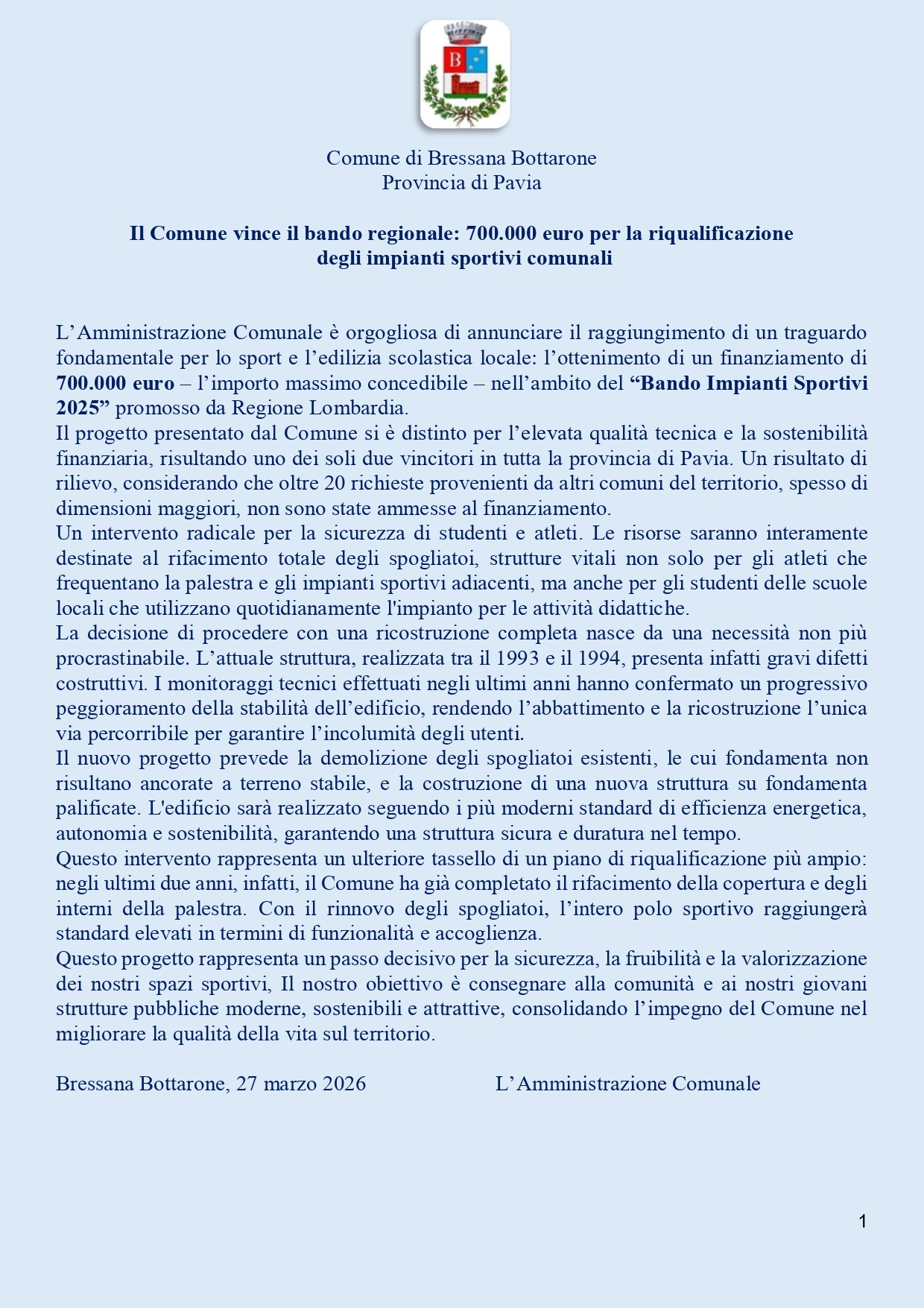 Il progetto presentato dal Comune si è distinto per l’elevata qualità tecnica e la sostenibilità finanziaria, risultando uno dei soli due vincitori in tutta la provincia di Pavia. Un risultato di rilievo, considerando che oltre 20 richieste provenienti da altri comuni del territorio, spesso di dimensioni maggiori, non sono state ammesse al finanziamento.
