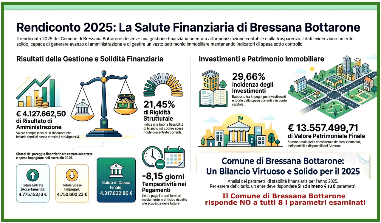 Il rendiconto dell'esercizio 2025 conferma la solidità strutturale del Comune di Bressana Bottarone, con un risultato di amministrazione di 4.127.662,50 € e il pieno rispetto di tutti i parametri di virtuosità finanziaria. Tuttavia, questo risultato è frutto di una gestione estremamente complessa, chiamata a bilanciare un significativo aumento della spesa sociale e dei servizi con una contrazione delle risorse esterne.