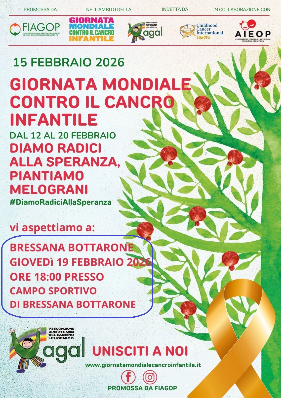 In occasione della Giornata Mondiale contro il Cancro Infantile, il nostro Comune ha aderito con entusiasmo all’iniziativa promossa dall’AGAL, scegliendo di piantare un melograno come simbolo di vita, speranza e rinascita.