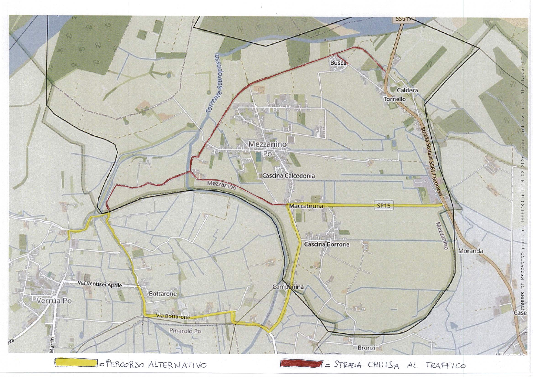 Il Comune di Mezzanino, dal 16/2/2026 al fino alla completa riapertura del Ponte sul Po di Bressana Bottarone, ha ordinato e disposto LA CHIUSURA TEMPORANEA al transito veicolare leggero e pesante di tutte le categorie di veicoli in entrambi i sensi di marcia della strada arginale e della strada di collegamento tra SP 15 presso l’incrocio con Via G. Marconi fino al confine con il Comune di Verrua Po,