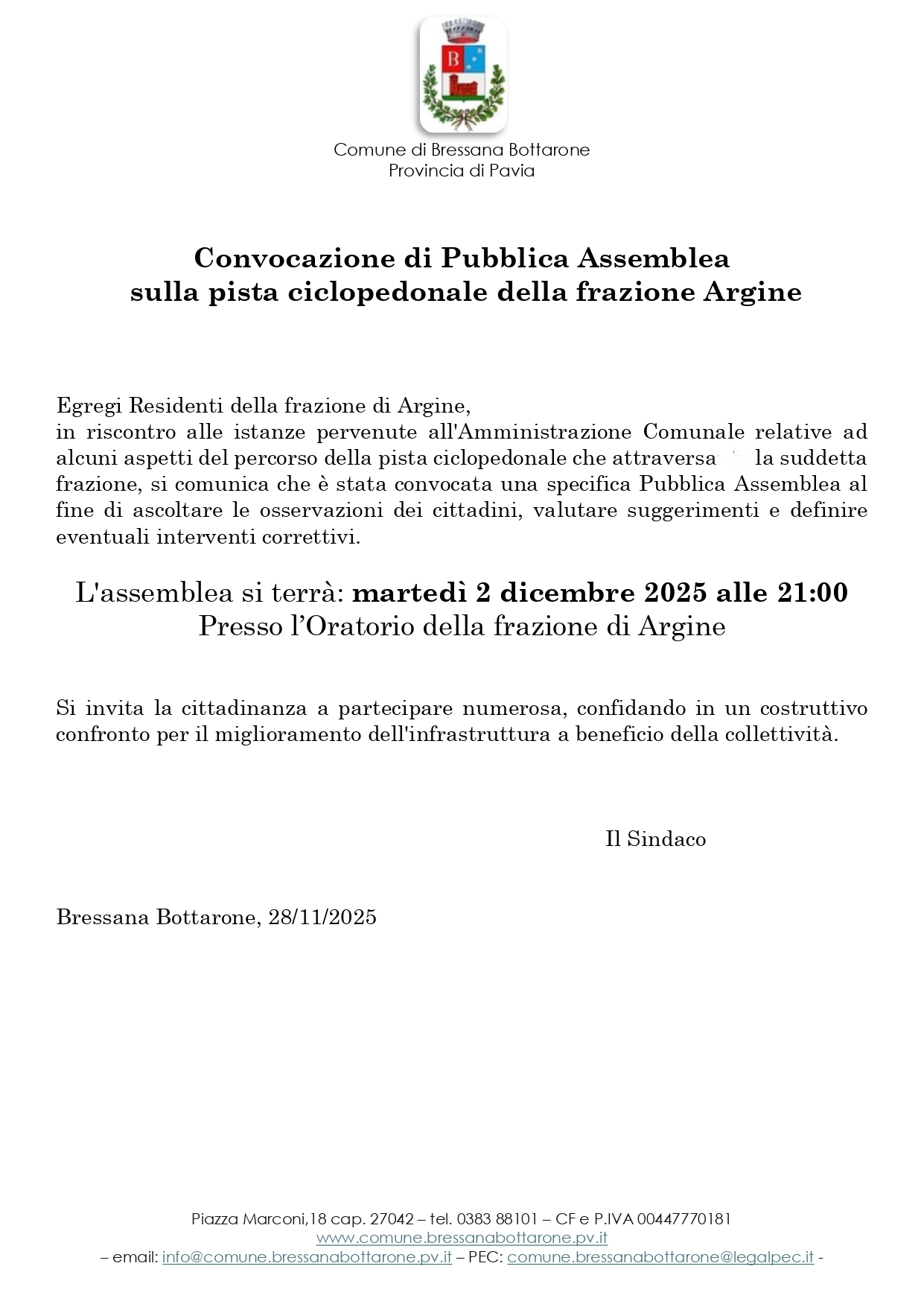 In riscontro alle istanze pervenute all'Amministrazione Comunale relative ad alcuni aspetti del percorso della pista ciclopedonale che attraversa la suddetta frazione, si comunica che è stata convocata una specifica Pubblica Assemblea al fine di ascoltare le osservazioni dei cittadini, valutare suggerimenti e definire eventuali interventi correttivi.