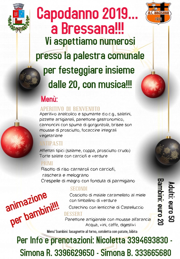 Capodanno a Bressana! Vi aspettiamo numerosi presso la palestra comunale per festeggiare insieme dalle 20, con musica, animazione per bambini e cena. Per info si veda la locandina allegata.
