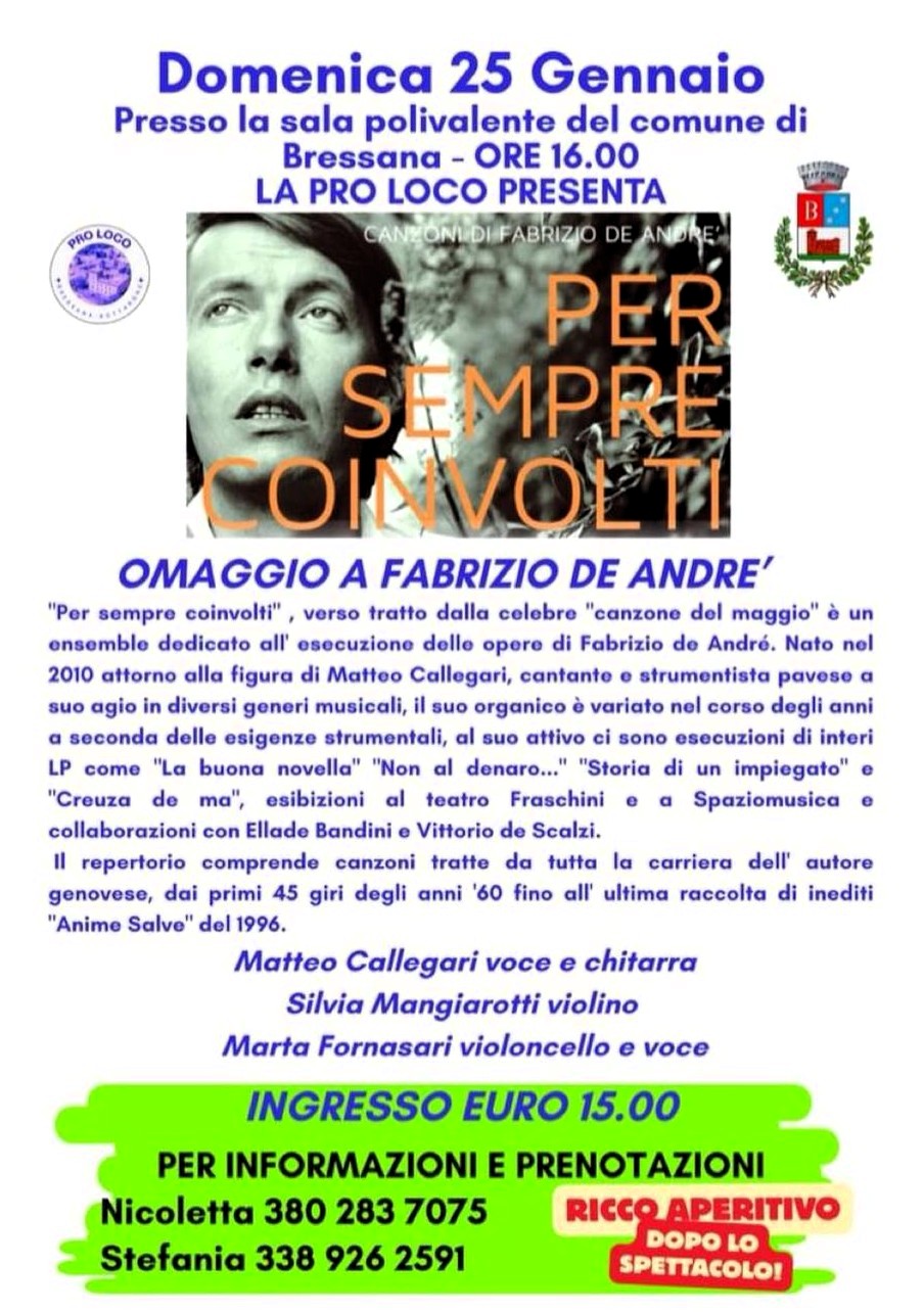 il 25 gennaio 2026 ore 16 in Sala Polivalente a Bressana il concerto tributo dedicato a Fabrizio De André. Un’occasione per riascoltare dal vivo capolavori senza tempo, interpretati con rispetto e passione, per celebrare l'intellettuale e il poeta che ha saputo dar voce a chi non ne ha mai avuta.