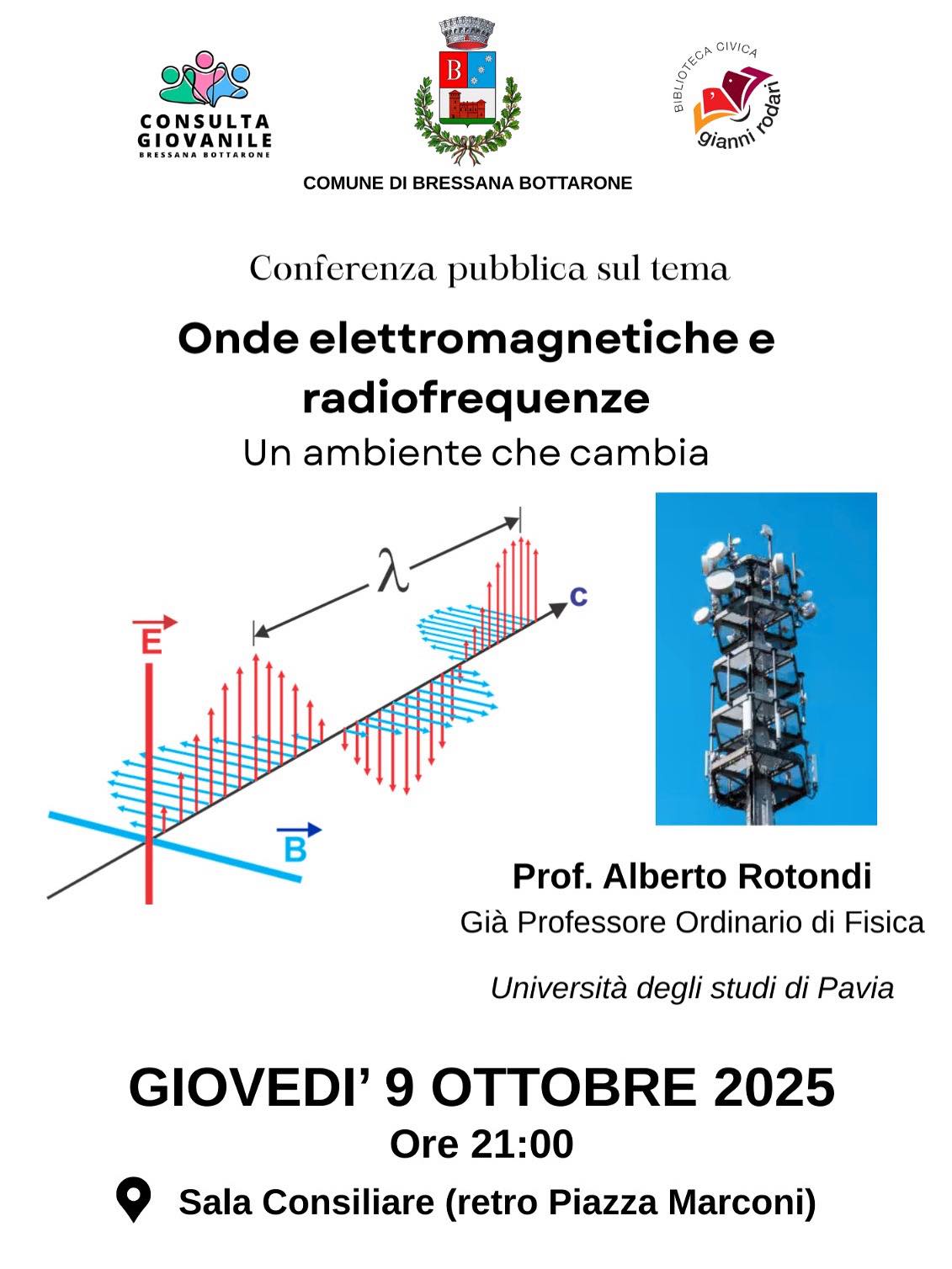 È con grande piacere che l’Amministrazione Comunale accoglie e presenta la conferenza del Prof. Alberto Rotondi dal titolo "Onde elettromagnetiche e radiofrequenze - Un ambiente che cambia". Attraverso la sua approfondita esperienza e competenza, il Prof. Rotondi ci guiderà nella comprensione di un tema di grande attualità e rilevanza, esplorando gli effetti, le implicazioni e le trasformazioni che le onde elettromagnetiche e le radiofrequenze stanno portando nel nostro ambiente quotidiano.