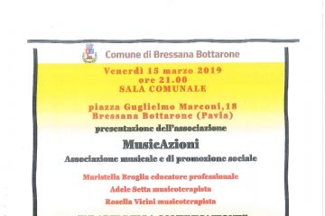 Venerdì 15 marzo alle ore 21 nella SALA CONSILIARE si terrà la presentazione dell'associazione MusicAzioni, Associazione musicale e di promozione sociale.
