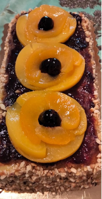 Guarnizione: pesche sciroppate e ciliegie sciroppate.